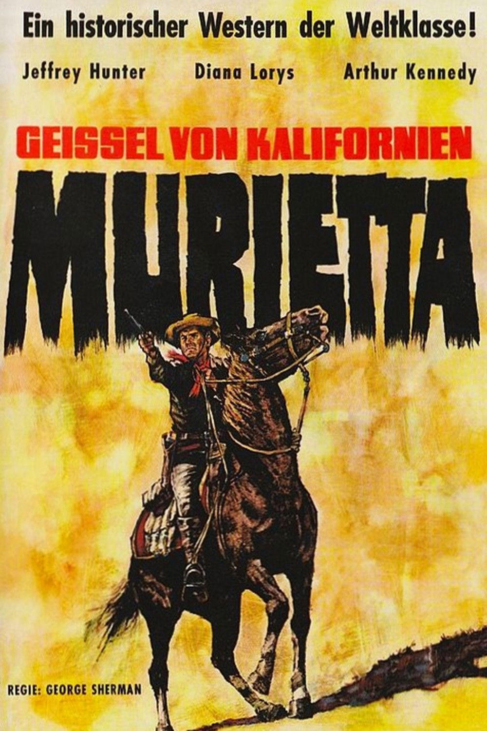 'Murieta" (Jeffrey Hunter) and his wife "Rosita" (Sara Lezana) are panning for gold when he discovers a strike! Their celebrations attract the attentions of their gringo neighbours and next thing we know, he is waking up battered and bruised and she is dead. He determines on revenge, but is actually a fairly law abiding person so having already befriended the decent "Capt. Love" (Arthur Kennedy) heads to the nearest town to bide his time - making his living doing card tricks - until these three killers return. When they do, his friend is unable to assure him that he will get justice from the system - one man's word against three - so he takes the law into his own hands, and to escape a lynching heads to the hills with a gang of bandits with whom he starts marauding. He picks his targets, though - a bit like "Robin Hood", his aim is to free the Californian people from the yoke of the encroaching hoodlums and "pioneers", but surely it is just a matter of time before the authorities - and his friend "Love" - apprehend him? It's actually not a bad adventure film this, and Hunter does enough to keep it moving along. It's just that the production standards are truly woeful and the dubbing - well, less said the better. The camerawork is wobbly, the sound the stuff of a student project and there is just far too much ropey dialogue. The story is solid - based on a real life character - but somehow George Sherman (who ought to have known better) just can't let the story and the star do enough of the heavy lifting without cluttering it up with third rate supporting stars and bad photography. I suppose it is interesting to see how the once box-office Hunter has been reduced to this, but otherwise it's truly disappointing.
