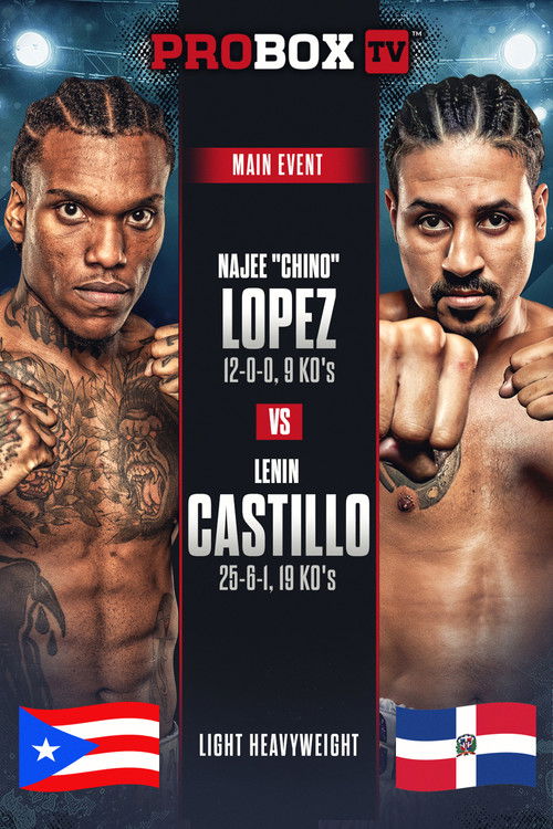 Unbeaten rising star Najee 'Chino' Lopez (12-0, 9 KOs) steps into the spotlight against seasoned contender Lenin Castillo (25-6-1, 19 KOs) in the main event at the ProBox TV Events Center in Plant City, Florida. Meanwhile, in the co-main event, the formidable Ruben 'El Pollito' Aguilar (22-0-1, 19 KOs) squares off against hard-hitting Cristian 'Guarico' Baez (19-4, 17 KOs) in what promises to be an explosive clash.
