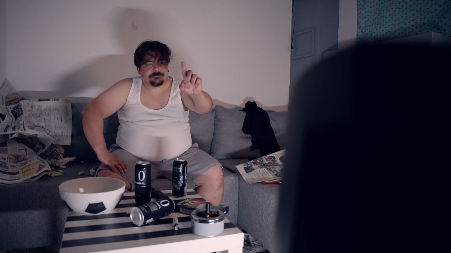 An angry man does angry stuff. A tv is involved.
