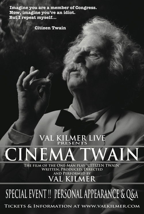 Val Kilmer, master of reinvention, becomes Mark Twain, in a funny, moving, contemporary and reflective performance, based on the life of the man who was Samuel Clemens and on his writings as Mark Twain: his thoughts on politics, his family, his faith and God… Twain shows the greatness of his incomparable wit.